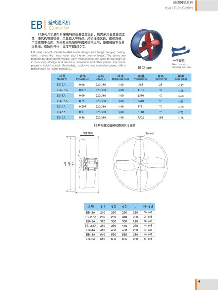 EB series adopt special twisted blade design and flange fianging casing,which makes the noise lower and the air