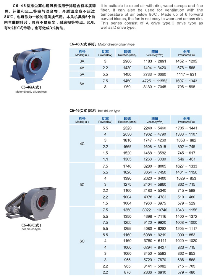 C6-46型排塵離心通風(fēng)機(jī)適用于排送含有本質(zhì)碎眉、纖維和塵土等空氣混合物,介